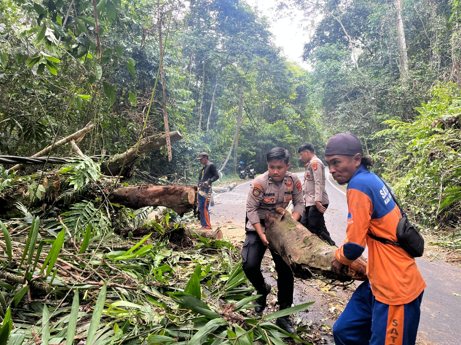 “Personel Polsek Bengkunat bekerja sama dengan Tim BPBD untuk memastikan jalan tetap dapat dilalui dengan memotong dan memangkas batang kayu yang mengahalangi sebagaian badan jalan dan melakukan pengaturan lalu lintas agar tidak terjadi kemacetan,” ujar IPDA Kasiyono.