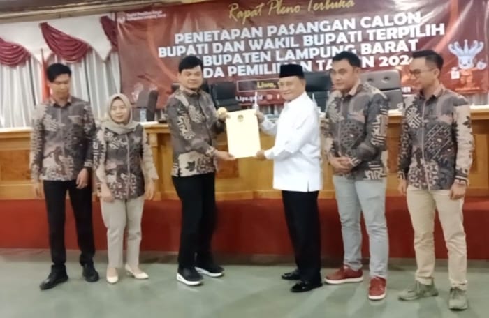PusaranNews.com, Lampung Barat – Komisi Pemilihan Umum (KPU) Lampung Barat, menetapkan Bupati dan Wakil Bupati terpilih, Periode 2024-2029 di Aula Keagungan Pemkab Setempat, Kamis 9 Januari 2025.