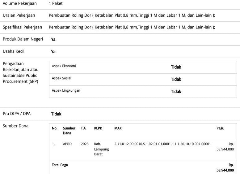 Telan 58 Juta Lebih, Belanja Rolling Door DLH Lampung Barat 2025 Beda di LKPP dengan Lapangan